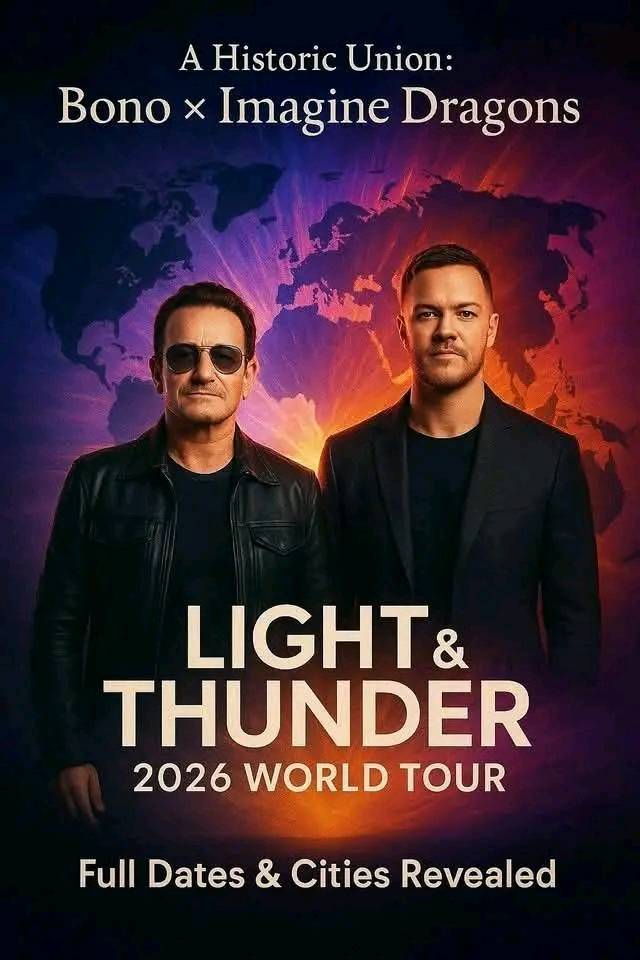 In a stunning announcement that sent shockwaves through the global music community, Bono and Imagine Dragons have confirmed a once-in-a-lifetime collaboration — a massive 2026 world tour that unites two generations of musical giants under one electrifying banner. Titled “Lights of the World,” this monumental tour promises to be far more than just a concert series; it’s an unprecedented fusion of artistry, activism, and soul-stirring performance designed to ignite hearts and bridge eras. Fans across continents have already begun calling it a historic union — the ultimate meeting point of U2’s spiritual grandeur and Imagine Dragons’ modern anthemic power.